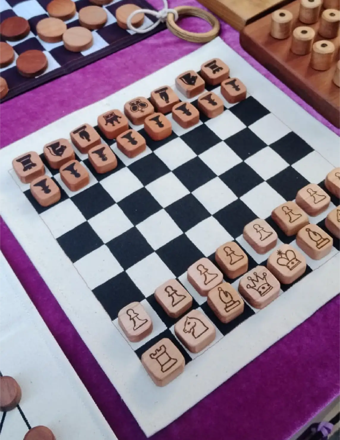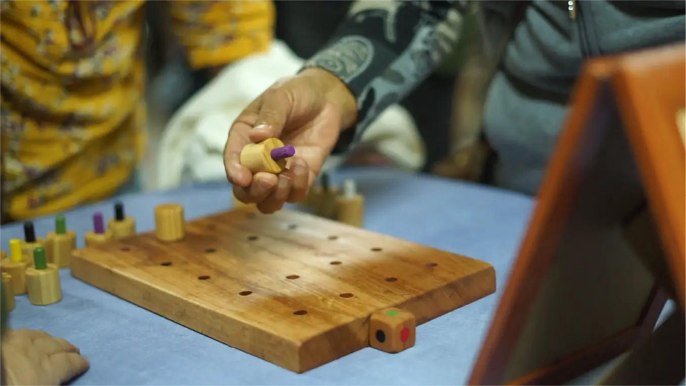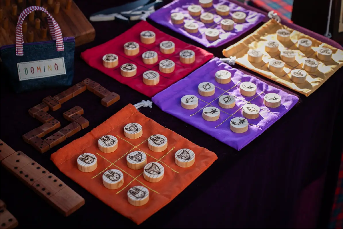 juegos de mesa artesanales, hechos principalmente con despuntes de madera nativa y diversos textiles. Juegos tales cómo el dominó, komikan, juego de memoria, pelotas de trapo, ajedrez, juego gato, etc.